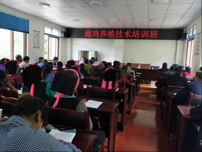 7月16日和7月31日-8月2日,在甘孜州科技局、康定市农牧农村和科技局、甘孜州畜科所组织下,刘益平一行针对泸定、康定周边养殖户、农技员、驻村干部和畜牧业相关从业人员各100余人,在康定市分别开展了以“藏鸡保种选育与扩繁推广”和“四川藏区藏鸡提档升级安全增效技术培训”为主题的养殖技术的基层科普培训和县级科技培训。在培训中,讲解了四川藏鸡的概况以及相关养殖技术知识外,发放了团队编写的《藏鸡养殖技术百问百答》技术手册,还对养殖户所遇到的饲养技术问题一一答疑,特别对当前非洲猪瘟疫病防控带来的畜牧行业的影响进行了相关探讨,并现场到达养殖户养殖地点进行现场养殖技术指导。