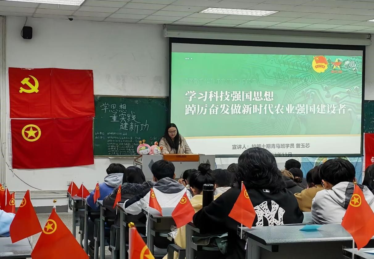 “科技创新大潮澎湃,千帆竞发勇进者胜”。本次示范性班团活动邀请校青马班曾玉芯同学分享理论践行经验,曾玉芯从精神实质、实践要求、时代责任三个部分介绍了科技创新对中国发展的重要性,号召同学们勇担时代责任、加强理论学习、提高自身素养。“务农重本,国之大纲”,通过观看习近平总书记两次来川考察调研视频,感悟三农情怀,鼓励同学们积极投身农业发展与乡村振兴,为全面发展高质量农业农村建设贡献出自己的一份力量。